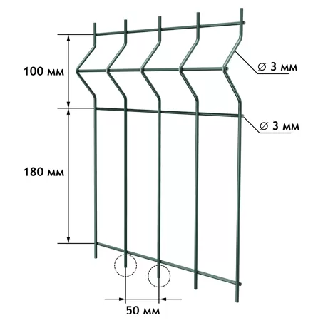 Основной элемент конструкции — металлические столбы, надёжно закреплённые в грунте при помощи бетонной смеси. Между столбами навешиваются секции из проволоки с V-образными изгибами, придающими конструкции дополнительную прочность.